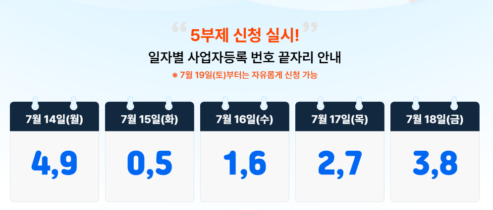 특히 5부제 일정 동안 신청하지 못하면 이후 신청은 몰릴 수 있으므로, 초기에 빠르게 신청하는 것이 유리합니다. 사업에 꼭 필요한 혜택인 만큼 미리 챙겨두시길 바랍니다.