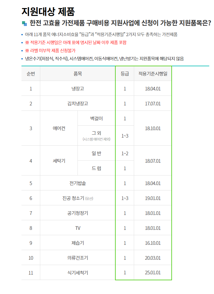 환급을 받기 위해서는 반드시 에너지소비효율 1등급 인증을 받은 제품을 구매해야 하며, 아래와 같은 제품군이 포함됩니다: